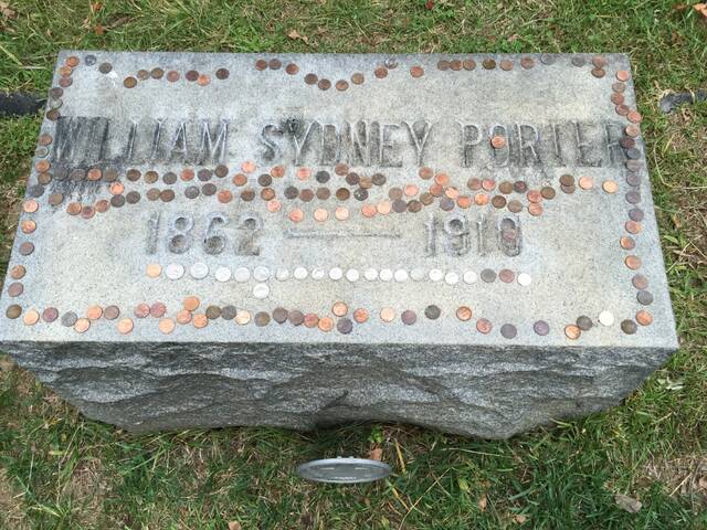 Laced around the outer edge of the modest tombstone is an uneven row of change. A few quarters, nickels and dimes, but mostly pennies. Both shiny and worn, a particularly heavy row underscores the name of the deceased, William Syndey Porter. A few quarters, dimes and nickels line the years 1862-1910.