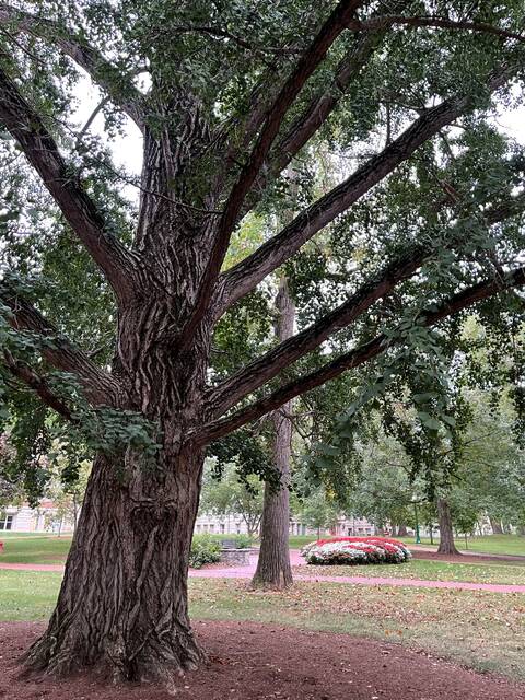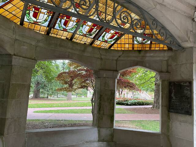 When my husband and I visited early one Saturday morning, we headed first to Sample Gates. Accentuated, like many other parts of campus, with crimson and cream blooms, the gates mark the western entrance to campus.
