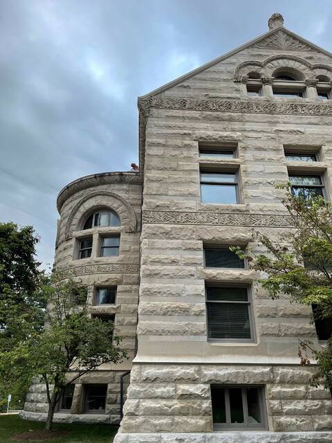 The buildings on the original main campus of Indiana University in Bloomington, Indiana, are all constructed from limestone. Brick-paved paths link together building after building.