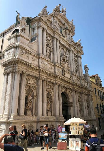 Venice, Italy’s, Church of Santa Maria del Giglio’s most notable characteristic is its facade, which features statutes not of saints but of the benefactor who funded its restoration.