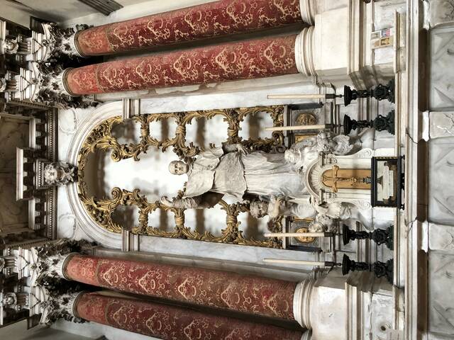 But when we place our attention on one particular statue, more questions arise: why is the figure holding what looks like a telescope? Or is that perhaps a rolled up map? What saint could that possibly be?