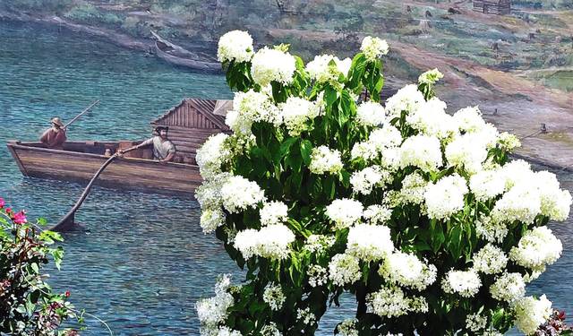 Flowers around this panel on Maysville’s floodwall seem to welcome these pioneers to Limestone Landing Tuesday.