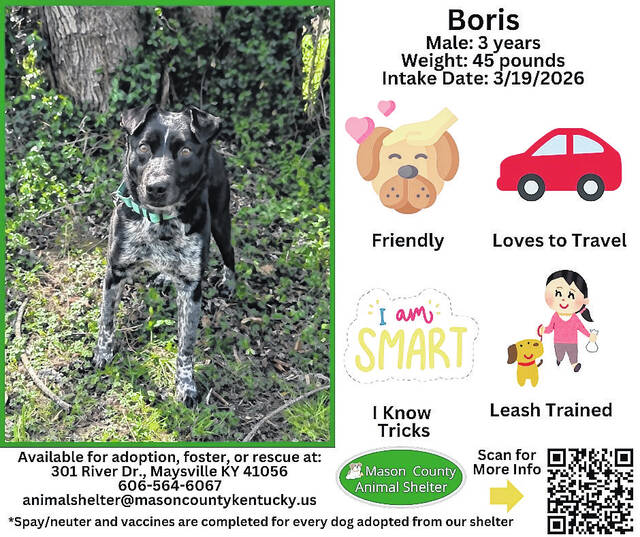 Prospective adopters need to fill out a short application online or at the shelter for adoption approval. Go to the shelter’s Adopt a Pet website to view all available animals and fill out the application to adopt at www.adoptapet.com/shelter/90606/available-pets/pets or visit the shelter’s Petfinder website at www.petfinder.com/member/us/ky/maysville/mason-county-animal-shelter-ky421.