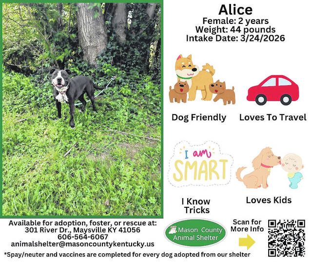 Prospective adopters need to fill out a short application online or at the shelter for adoption approval. Go to the shelter’s Adopt a Pet website to view all available animals and fill out the application to adopt at www.adoptapet.com/shelter/90606/available-pets/pets or visit the shelter’s Petfinder website at www.petfinder.com/member/us/ky/maysville/mason-county-animal-shelter-ky421.