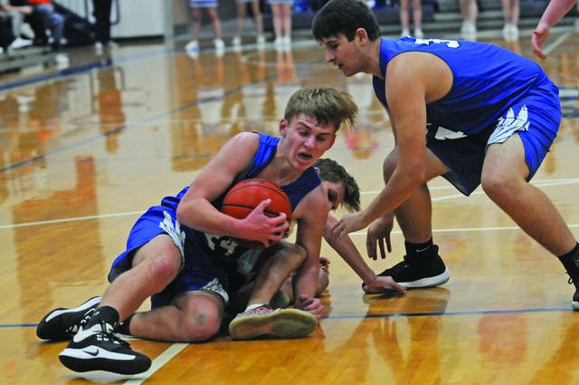 Ripley’s Cody Germann battles for a loose ball in Saturday’s contest with Dayton at the Ripley Holiday Classic. (Evan Dennison, The Ledger Independent)